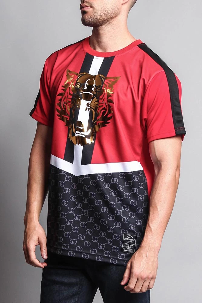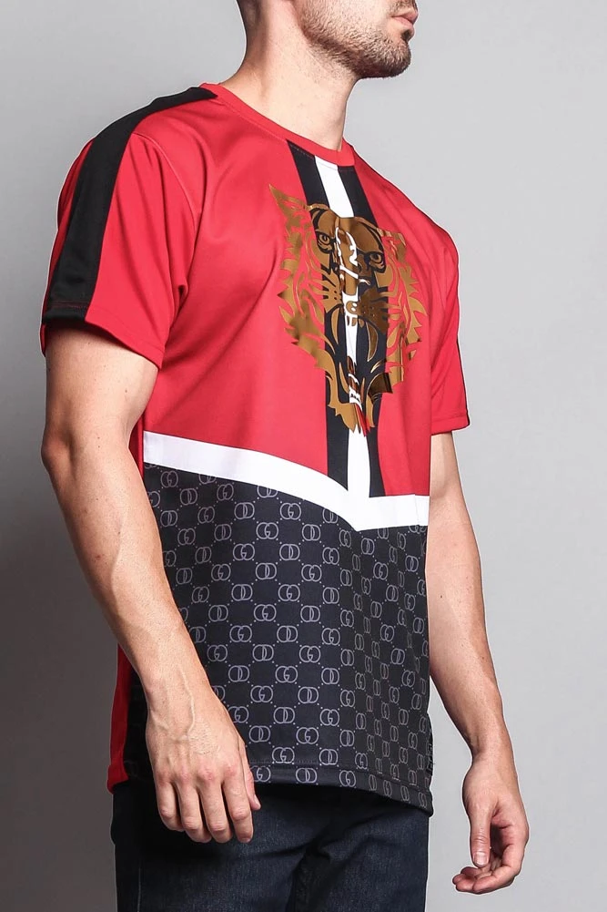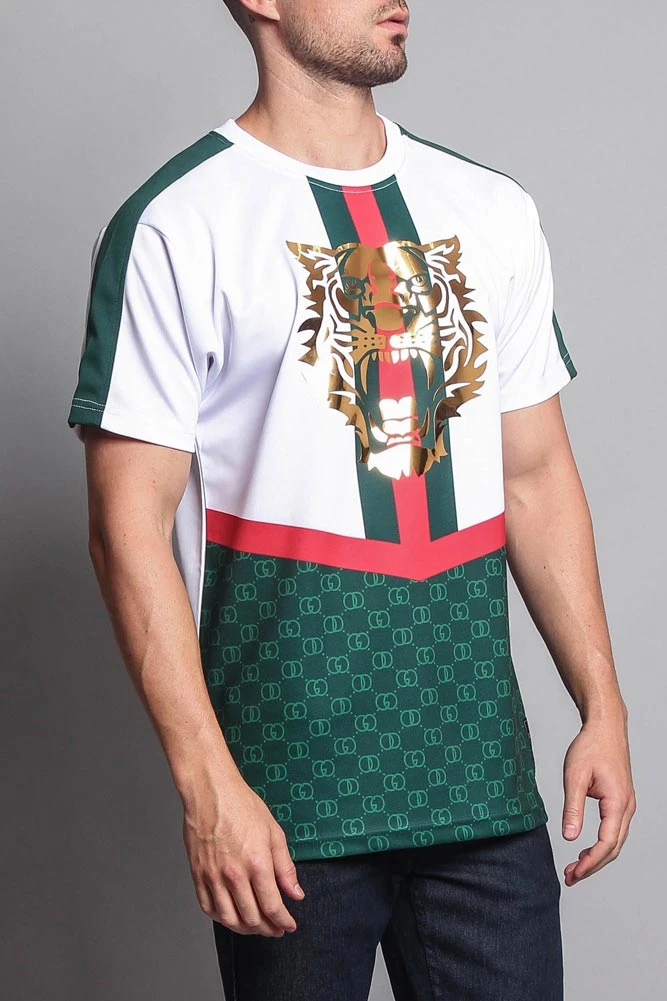 Stick with the trends and look stylish in our G Tiger t shirt inspired by current name brands dominating the fashion industry. This shirt features a trendy background as well as a golden foiled tiger head.Â