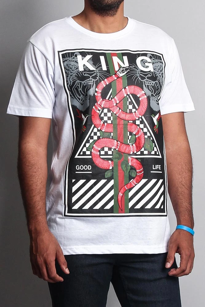 Stick with the trends in our high fashion inspired t shirt. Features green/red stripes, checkerboard, a bold snake design and so much more.