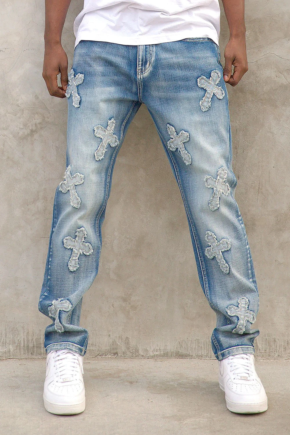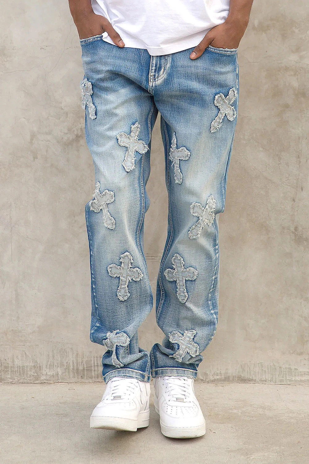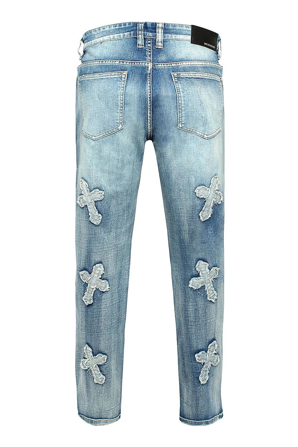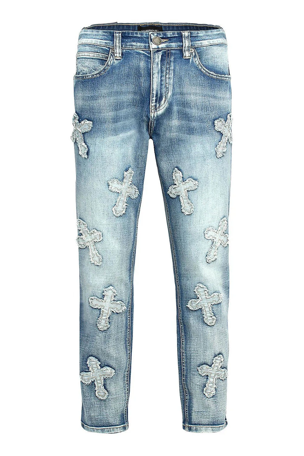- Cross patches all over on denim jeans with indigo wash all throughout