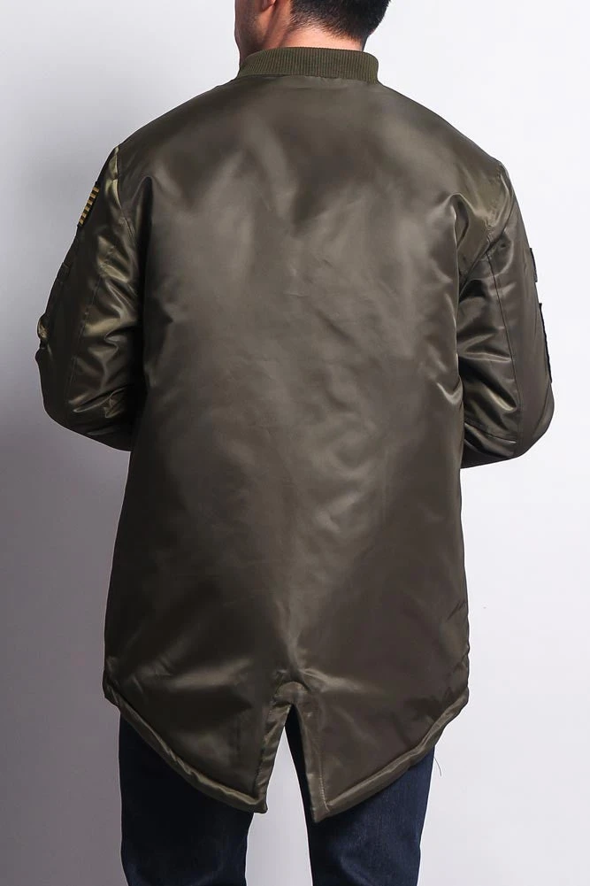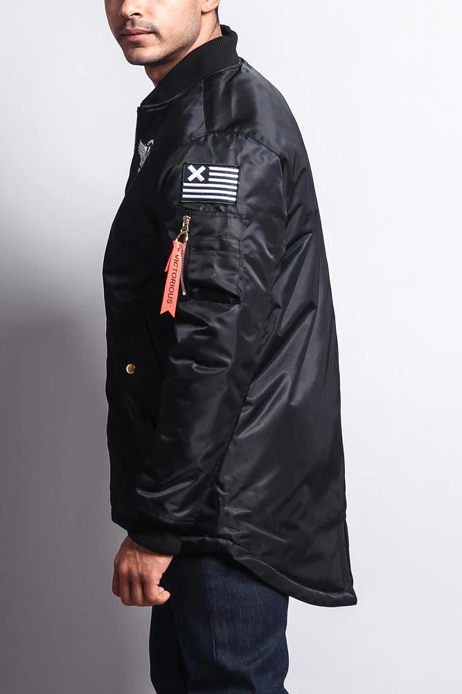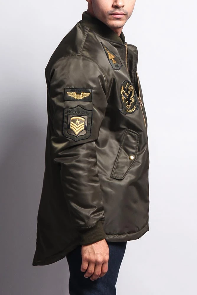 The MA-1 style flight/bomber jacket is a classic style that should be had in every man’s closet. Step your game up with this version that features an extended length and various patches.