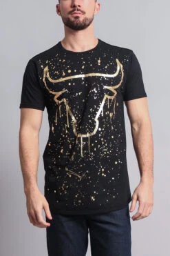 Metallic Paint Splattered Bull Logo Long Length Curved Hem T-Shirt