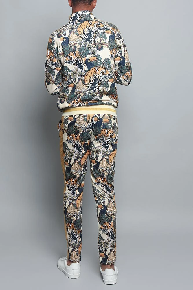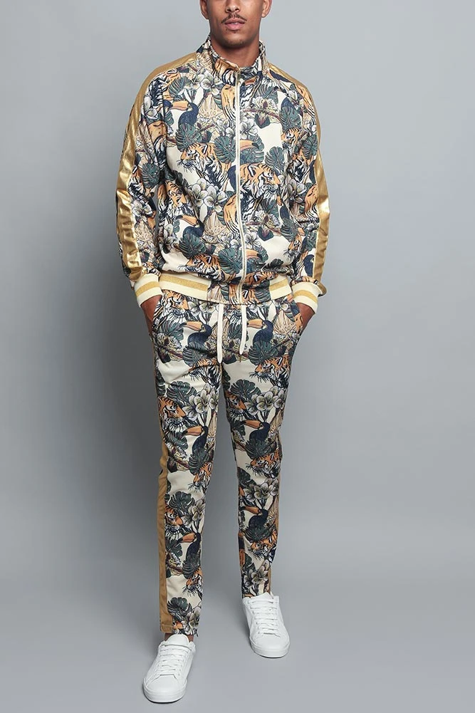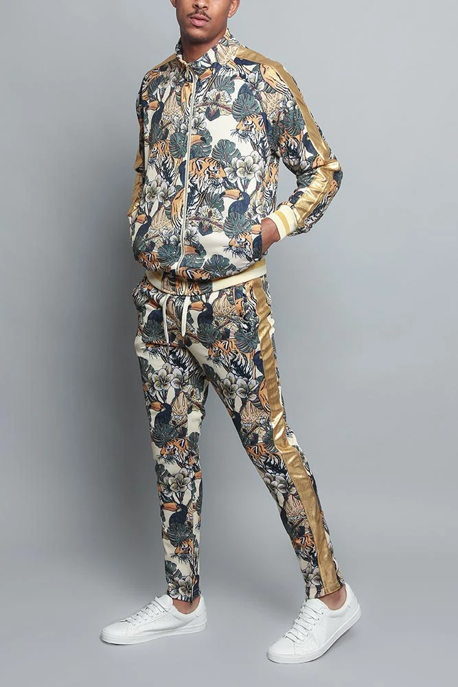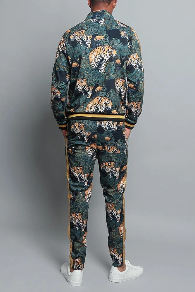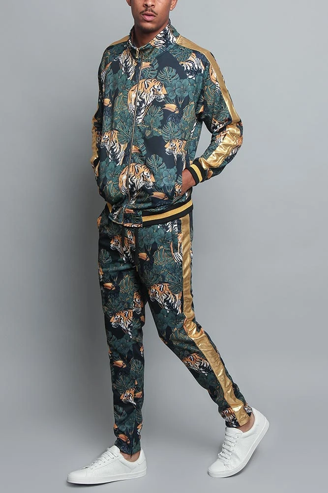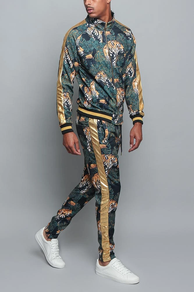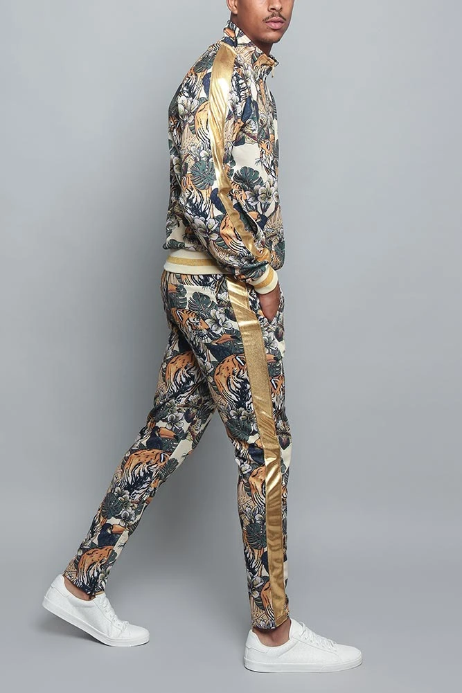 Follow the latest trends inspired by your favorite hip hop artists. Feel comfortable and look fly in our tiger track suit featuring, metallic gold strips going down your arms and legs, gold bands around the wrist and waist, an adjustable waistline, and a zipper by the ankle for a custom fit.Â
