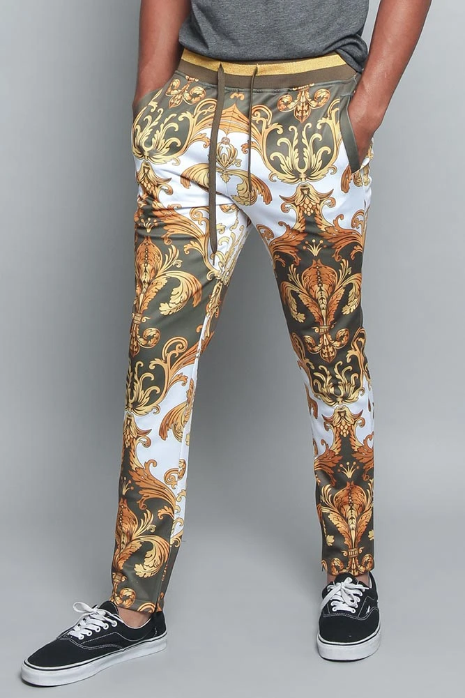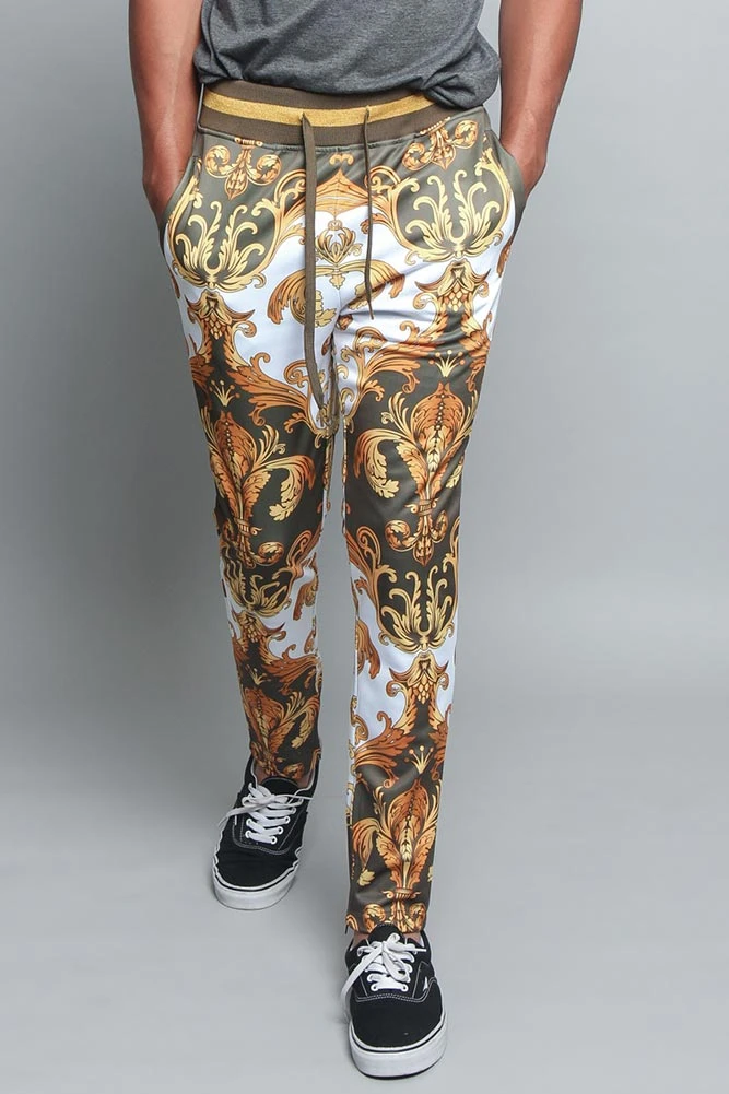 Follow the latest trends inspired by your favorite hip hop artists. Feel comfortable and look fly in our luxury print track pants featuring adjustable drawstrings at the waist, a gold striped waistband and a zipper by the ankle for a custom fit.Â